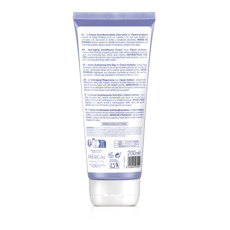 Crema acondicionadora antiedad capilar de Clearé Institute, que reduce la edad biológica de tu cabello a la vez que facilita el peinado y le devuelve el brillo y vitalidad perdidos. El resultado, un cabello visiblemente más joven, más fácil de peinar y sin encrespamiento. 96.5% de ingredientes naturales.