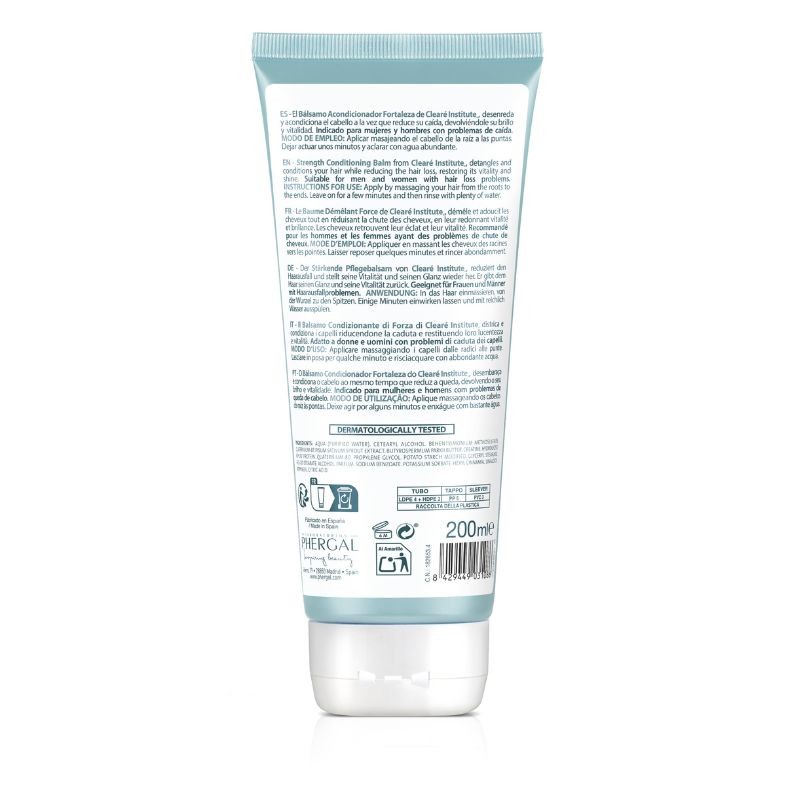 Bálsamo acondicionador capilar de Clearé Institute, desenreda y acondiciona el cabello a la vez que estimula su crecimiento y fortaleza devolviéndole su brillo y vitalidad. Indicado para mujeres y hombres con problemas de caída. 96.6% ingredientes naturales.
