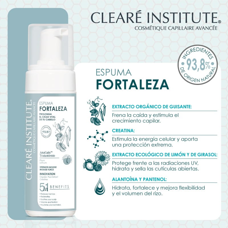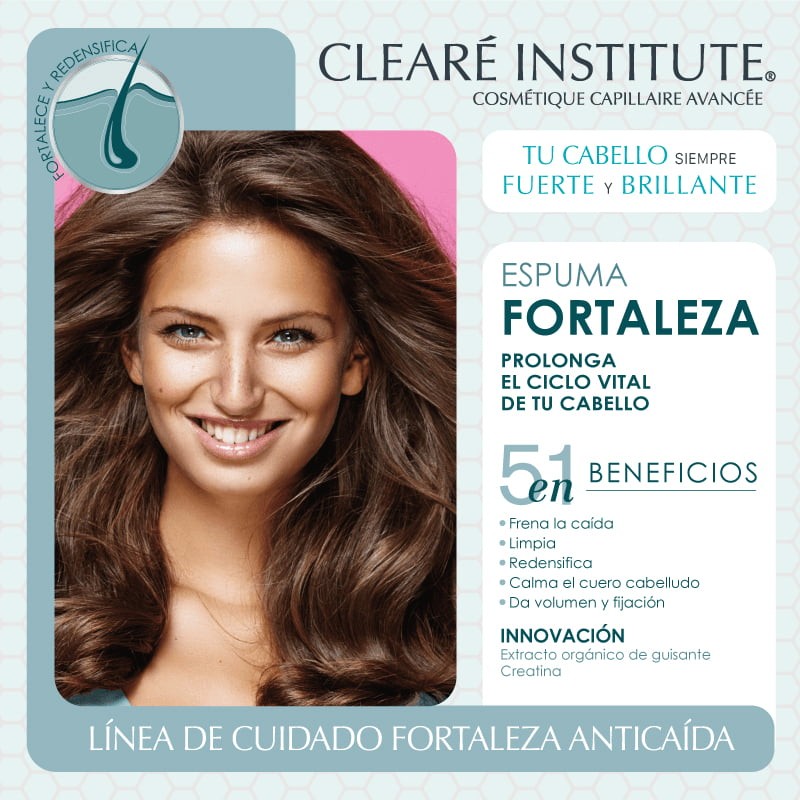 La Espuma fortaleza anticaída de Clearé Institute desenreda y acondiciona el cabello a la vez que estimula su crecimiento y fortaleza devolviéndole su brillo y vitalidad. Indicado para mujeres y hombres con problemas de caída.