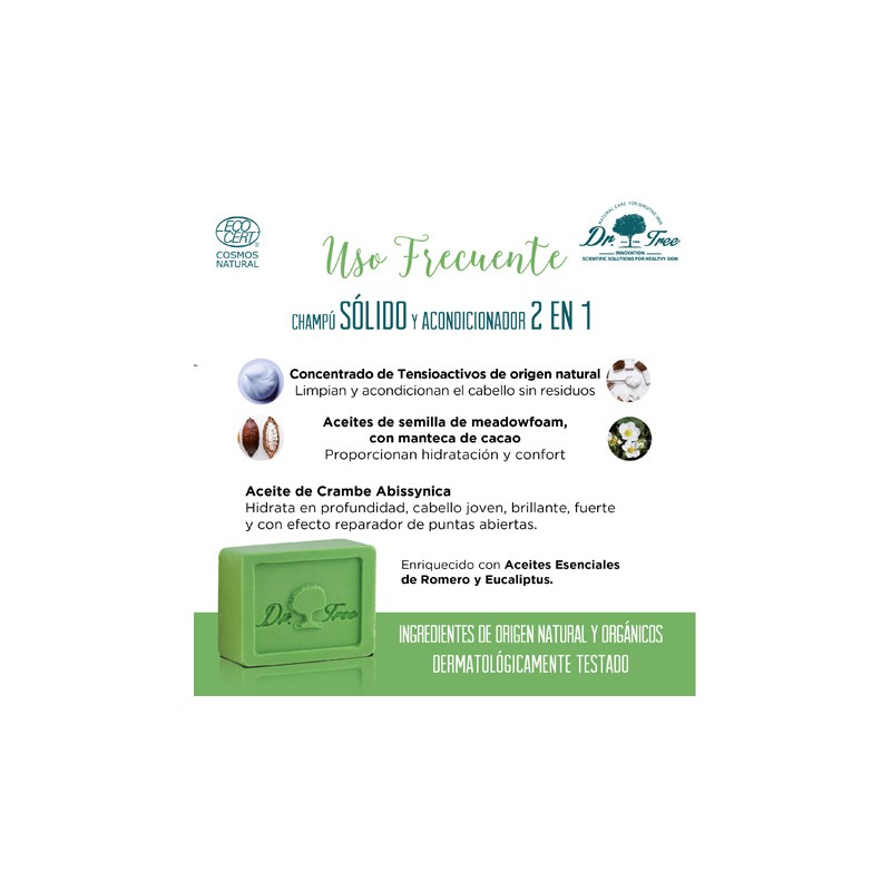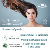 Champú sólido 2 en 1 de uso frecuente ¿Cómo se usa?. Humedece tu cabello con agua. Desliza la pastilla varias veces por el cabello. Masajea con las manos suavemente la raíz y el cabello como lo harías habitualmente con tu champú líquido formando espuma. Acláralo con agua, comprobarás tu cabello limpio, brillante y acondicionado. En tu higiene habitual deja la pastilla al aire libre para que se seque, y si viajas usa la jabonera.