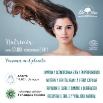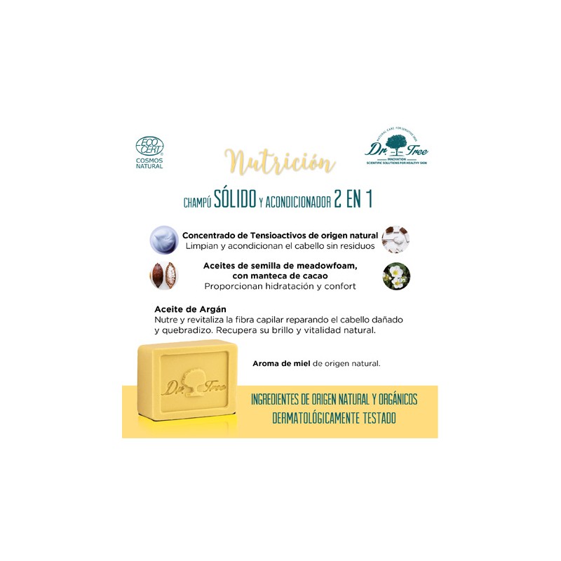 Champú sólido nutrición 2 en 1 ¿Cómo se usa? Para utilizar el champú sólido nutrición 2 en 1, desliza la pastilla varias veces por el cabello. Masajea con las manos suavemente la raíz y el cabello como lo harías habitualmente con tu champú líquido formando espuma. Acláralo con agua, comprobarás tu cabello limpio, brillante y acondicionado. En tu higiene habitual deja la pastilla al aire libre para que se seque, y si viajas usa la jabonera. Catálogo de champú sólido en pastilla de Dr. Tree.